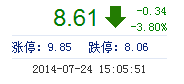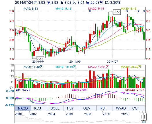 今開: 8.93 成交量: 20.63萬手 振幅: 3.91% 最高: 8.93 成交額: 1.80億元 換手率: 2.32% 最低: 8.58 總市值: 76.73億 市凈率: 2.87 昨收: 8.95 流通市值: 76...