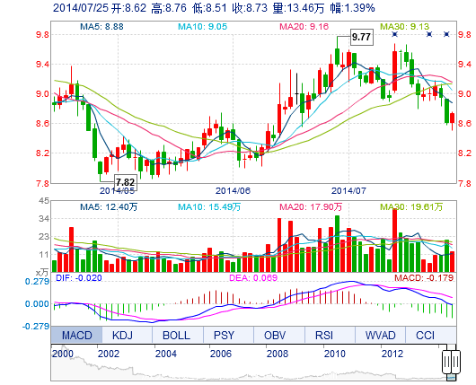 今開: 8.62 成交量: 13.46萬手 振幅: 2.90% 最高: 8.76 成交額: 1.16億元 換手率: 1.51% 最低: 8.51 總市值: 77.79億 市凈率: 2.91 昨收: 8.61 流通市值: 77...