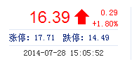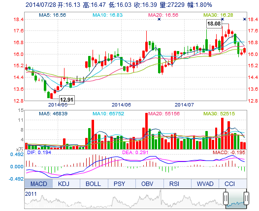 | 今 開: | 16.13 | 成交量: | 2.72萬手 | 振 幅: | 2.73% |