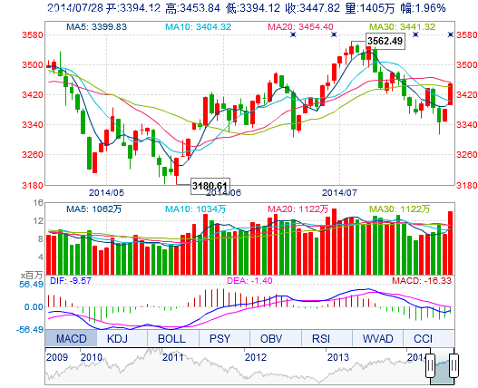 今開: 3394.12 最高: 3453.84 昨收: 3381.63 最低: 3394.12 成交量: 1404.74萬手 振幅: 1.77% 成交額: 196.12億元