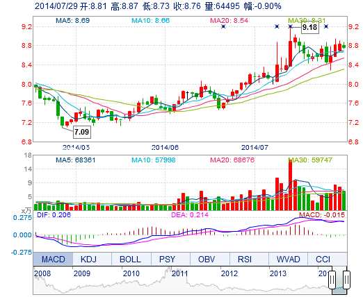 今開: 8.81 成交量: 6.45萬手 振幅: 1.58% 最高: 8.87 成交額: 5675.46萬元 換手率: 2.35% 最低: 8.73 總市值: 24.97億 市凈率: 3.89 昨收: 8.84 流通市值: ...