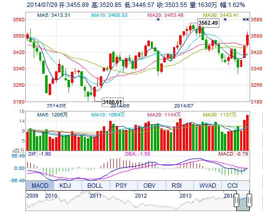 今開: 3455.89 最高: 3520.85 昨收: 3447.82 最低: 3446.57 成交量: 1630.01萬手 振幅: 2.15% 成交額: 239.41億元