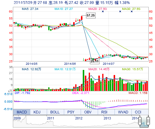 | 今 開: | 27.68 | 成交量: | 15.15萬手 | 振 幅: | 2.79% |