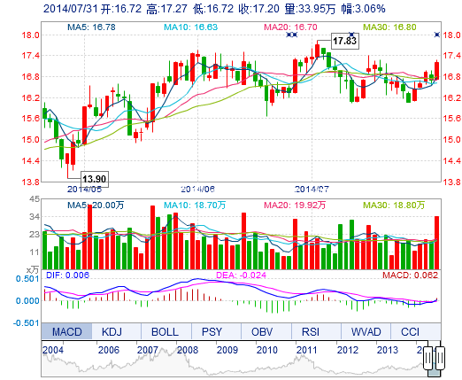 | 最 高: | 17.27 | 成交額: | 5.81億元 | 換手率: | 3.55% |