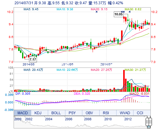 今開: 9.38 成交量: 15.37萬手 振幅: 2.44% 最高: 9.55 成交額: 1.45億元 換手率: 3.52% 最低: 9.32 總市值: 41.36億 市凈率: 2.97 昨收: 9.43 流通市值: 41...