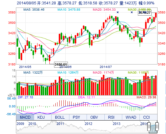 今開: 3541.28 最高: 3578.27 昨收: 3543.26 最低: 3518.58 成交量: 1423.36萬手 振幅: 1.68% 成交額: 225.37億元