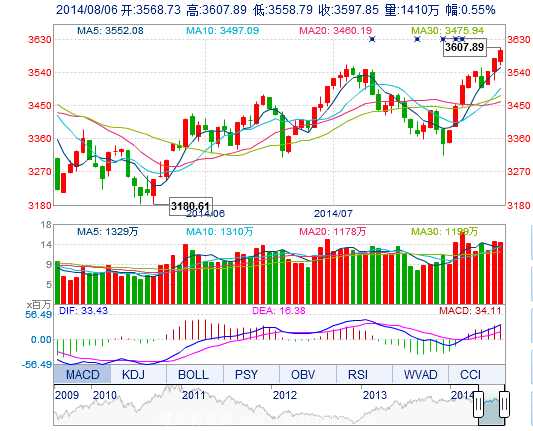 今開: 3568.73 最高: 3607.89 昨收: 3578.27 最低: 3558.79 成交量: 1410.09萬手 振幅: 1.37% 成交額: 207.21億元