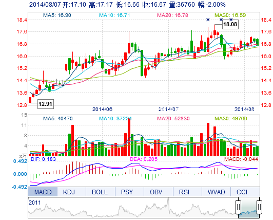 今開: 17.10 成交量: 3.68萬手 振幅: 3.00% 最高: 17.17 成交額: 6202.27萬元 換手率: 2.74% 最低: 16.66 總市值: 23.11億 市凈率: 6.28 昨收: 17.01 流通市...