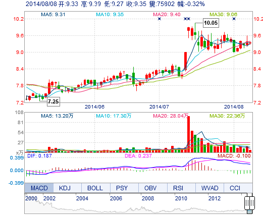今開: 9.33 成交量: 7.58萬手 振幅: 1.28% 最高: 9.39 成交額: 7079.03萬元 換手率: 1.74% 最低: 9.27 總市值: 40.84億 市凈率: 2.93 昨收: 9.35 流通市值: ...