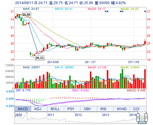 今開: 24.71 成交量: 6.01萬手 振幅: 8.26% 最高: 26.75 成交額: 1.55億元 換手率: 1.15% 最低: 24.71 總市值: 168.87億 市凈率: 6.44 昨收: 24.71 流通市值...