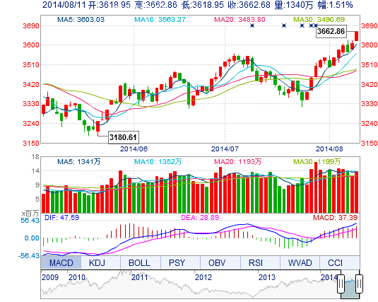 今開: 3618.95 最高: 3662.86 昨收: 3608.10 最低: 3618.95 成交量: 1339.95萬手 振幅: 1.22% 成交額: 216.24億元