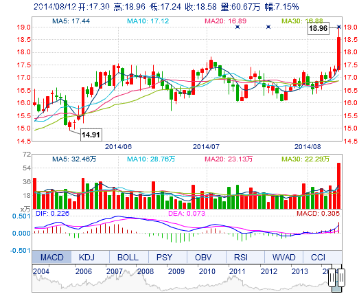 今開: 17.30 成交量: 60.67萬手 振幅: 9.92% 最高: 18.96 成交額: 10.98億元 換手率: 6.34% 最低: 17.24 總市值: 196.13億 市凈率: 5.32 昨收: 17.34 流通市...