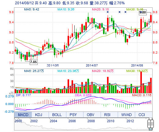 今開: 9.40 成交量: 38.27萬手 振幅: 4.78% 最高: 9.80 成交額: 3.68億元 換手率: 4.29% 最低: 9.35 總市值: 86.26億 市凈率: 3.22 昨收: 9.42 流通市值: 86...
