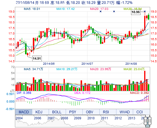 今開: 18.69 成交量: 20.71萬手 振幅: 3.49% 最高: 18.85 成交額: 3.83億元 換手率: 2.17% 最低: 18.20 總市值: 193.06億 市凈率: 5.24 昨收: 18.61 流通市值...