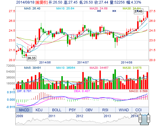 | 今 開: | 26.50 | 成交量: | 5.23萬手 | 振 幅: | 3.61% |