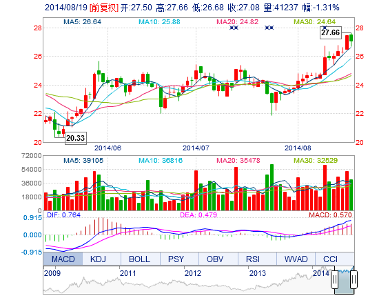 今開: 27.50 成交量: 4.12萬手 振幅: 3.57% 最高: 27.66 成交額: 1.12億元 換手率: 0.79% 最低: 26.68 總市值: 176.96億 市凈率: 9.73 昨收: 27.44 流通市值...