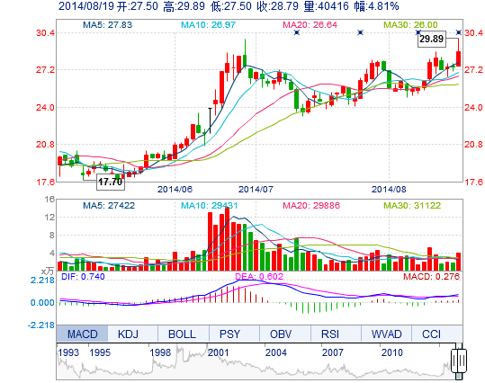 今開: 27.50 成交量: 4.04萬手 振幅: 8.70% 最高: 29.89 成交額: 1.17億元 換手率: 2.33% 最低: 27.50 總市值: 50.00億 市凈率: 14.46 昨收: 27.47 流通市值...
