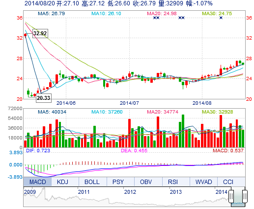 | 今 開: | 27.10 | 成交量: | 3.29萬手 | 振 幅: | 1.92% |