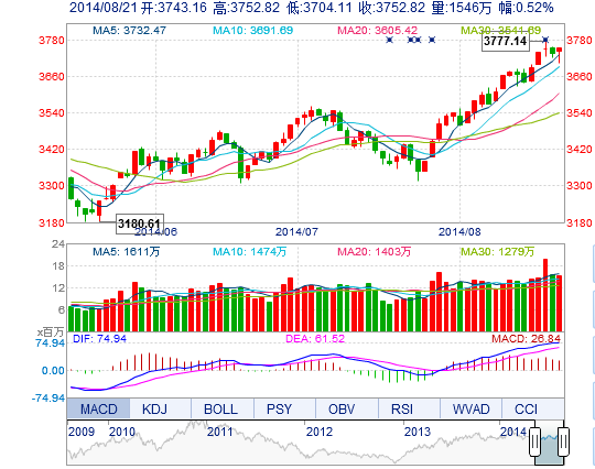 今開: 3743.16 最高: 3752.82 昨收: 3733.48 最低: 3704.11 成交量: 1545.83萬手 振幅: 1.30% 成交額: 264.54億元