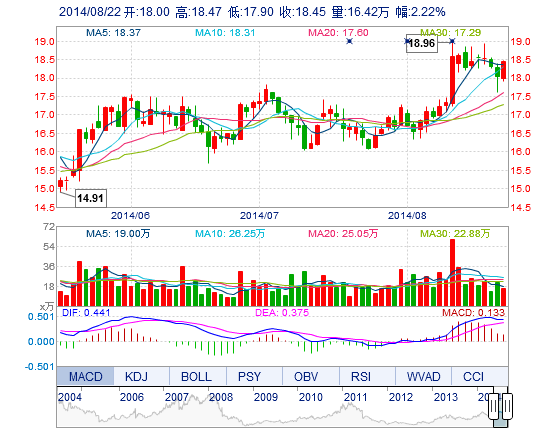 今開: 18.00 成交量: 16.42萬手 振幅: 3.16% 最高: 18.47 成交額: 2.99億元 換手率: 1.72% 最低: 17.90 總市值: 194.75億 市凈率: 5.28 昨收: 18.05 流通市值...