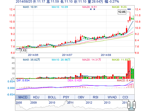 今開: 11.17 成交量: 28.64萬手 振幅: 4.40% 最高: 11.59 成交額: 3.24億元 換手率: 10.42% 最低: 11.10 總市值: 31.64億 市凈率: 4.93 昨收: 11.13 流通市值...