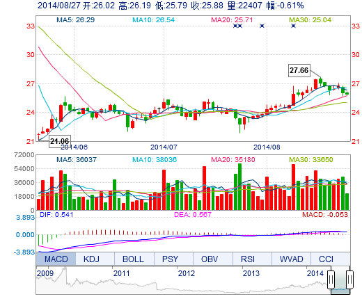 | 最 低: | 25.79 | 總市值: | 169.12億 | 市凈率: | 9.30 |