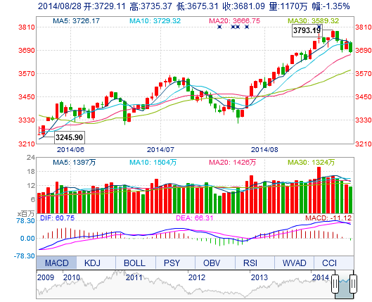 今開: 3729.12 最高: 3735.37 昨收: 3731.51 最低: 3675.31 成交量: 1169.58萬手 振幅: 1.61% 成交額: 220.83億元