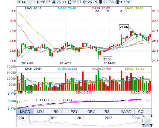 | 最 低: | 26.27 | 總市值: | 174.80億 | 市凈率: | 9.61 |