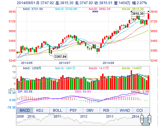 今開: 3747.92 最高: 3815.30 昨收: 3737.80 最低: 3747.92 成交量: 1454.12萬手 振幅: 1.80% 成交額: 262.32億元