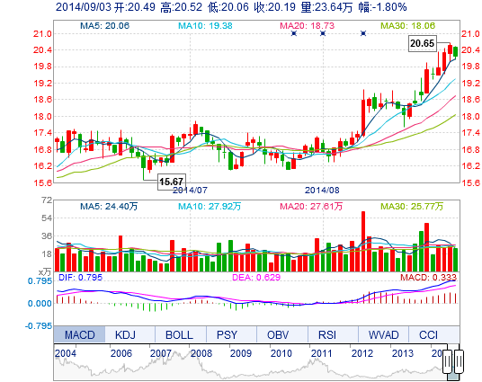 今開: 20.49 成交量: 23.64萬手 振幅: 2.24% 最高: 20.52 成交額: 4.79億元 換手率: 2.47% 最低: 20.06 總市值: 213.16億 市凈率: 5.79 昨收: 20.56 流通市值...