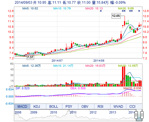 | 今 開: | 10.95 | 成交量: | 15.84萬手 | 振 幅: | 3.09% |
