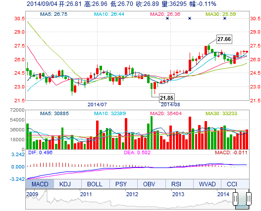 今開: 26.81 成交量: 3.63萬手 振幅: 0.97% 最高: 26.96 成交額: 9731.98萬元 換手率: 0.69% 最低: 26.70 總市值: 175.72億 市凈率: 9.66 昨收: 26.92 流通市...
