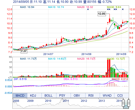 | 最 高: | 11.14 | 成交額: | 8809.69萬元 | 換手率: | 2.90% |