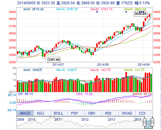 今開: 3923.40 最高: 3926.04 昨收: 3915.90 最低: 3889.50 成交量: 1791.68萬手 振幅: 0.93% 成交額: 317.15億元