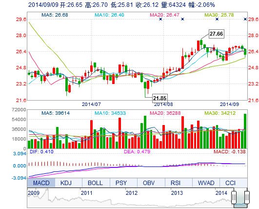 | 今 開: | 26.65 | 成交量: | 6.43萬手 | 振 幅: | 3.34% |