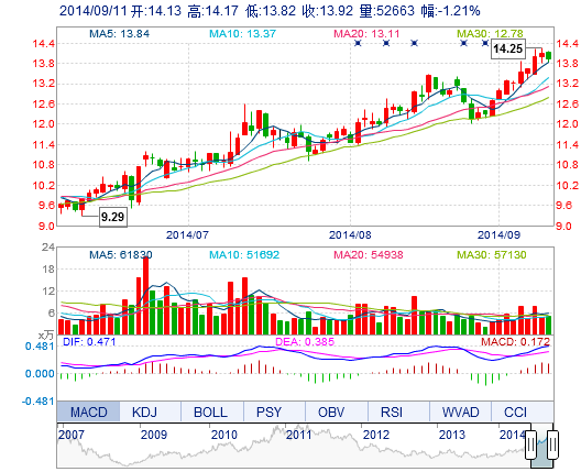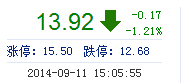| 今 開: | 14.13 | 成交量: | 5.27萬手 | 振 幅: | 2.48% |
