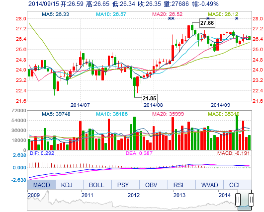 今開: 26.59 成交量: 2.77萬手 振幅: 1.17% 最高: 26.65 成交額: 7324.33萬元 換手率: 0.53% 最低: 26.34 總市值: 172.19億 市凈率: 9.47 昨收: 26.48 流通市...
