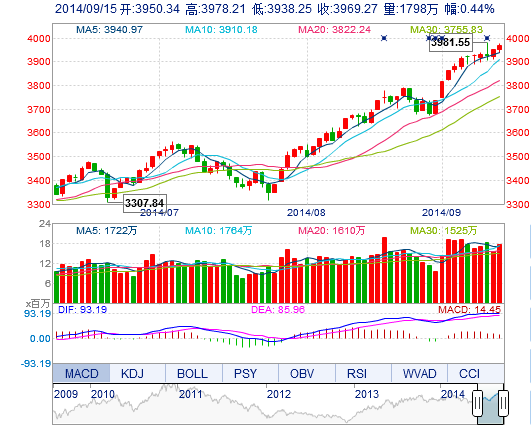 今開: 3950.34 最高: 3978.21 昨收: 3952.03 最低: 3938.25 成交量: 1798.43萬手 振幅: 1.01% 成交額: 315.29億元