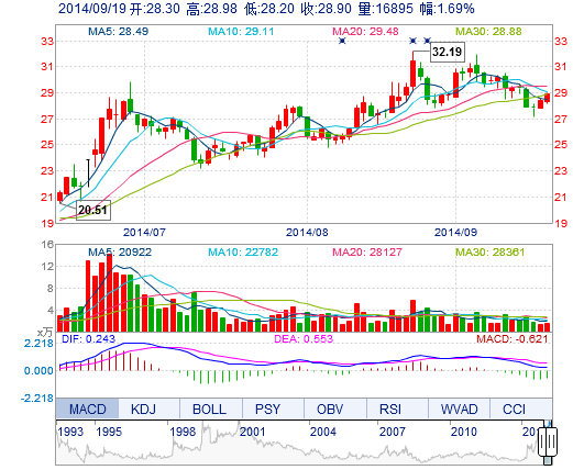| 今 開: | 28.30 | 成交量: | 1.69萬手 | 振 幅: | 2.74% |