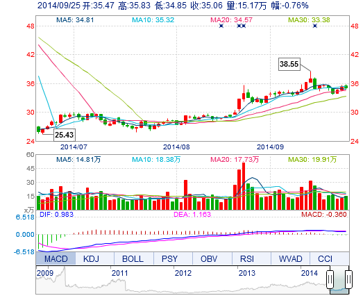 今開: 35.47 成交量: 15.17萬手 振幅: 2.77% 最高: 35.83 成交額: 5.35億元 換手率: 2.39% 最低: 34.85 總市值: 229.59億 市凈率: 13.50 昨收: 35.33 流通市...