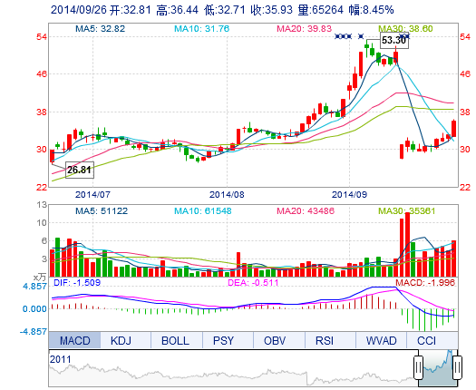 今開: 32.81 成交量: 6.53萬手 振幅: 11.26% 最高: 36.44 成交額: 2.31億元 換手率: 10.00% 最低: 32.71 總市值: 45.27億 市凈率: 8.56 昨收: 33.13 流通市值...