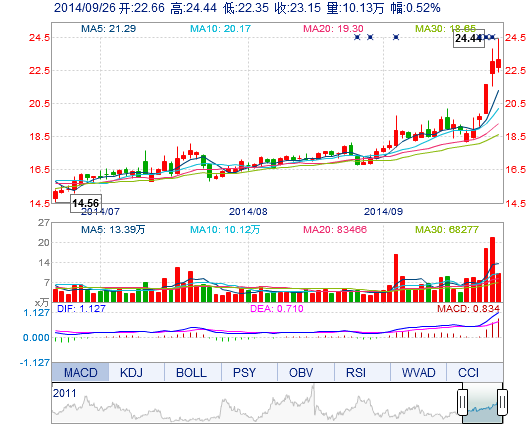 | 最 高: | 24.44 | 成交額: | 2.36億元 | 換手率: | 7.56% |