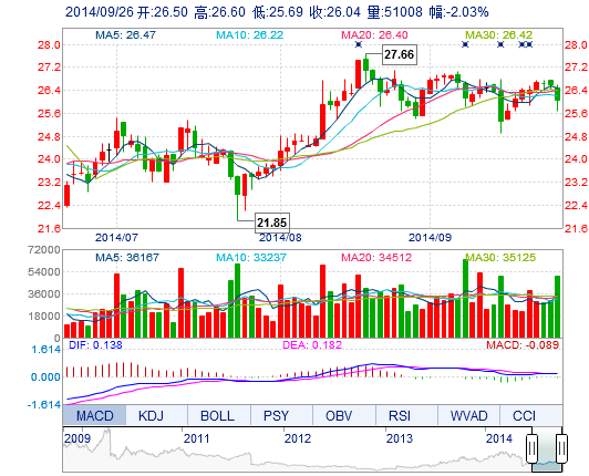 今開: 26.50 成交量: 5.10萬手 振幅: 3.42% 最高: 26.60 成交額: 1.33億元 換手率: 0.97% 最低: 25.69 總市值: 170.16億 市凈率: 9.36 昨收: 26.58 流通市值...
