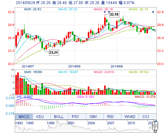 | 今 開: | 28.26 | 成交量: | 1.54萬手 | 振 幅: | 2.34% |