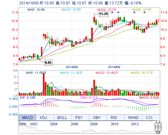 | 今 開: | 10.85 | 成交量: | 13.72萬手 | 振 幅: | 2.76% |