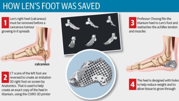 “科學的進步使我們能夠考慮3D打印骨頭,我們能夠從Len的腳上獲得信息,并告訴計算機他的腳的確切大小,然后使用最新的3D打印技術(shù)復(fù)制出來。”Choong教授說。
