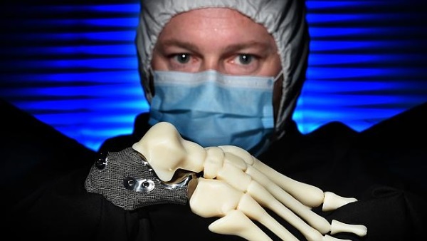醫(yī)療小組首先對Chandler先生無瘤的左腳進行3D掃描。結(jié)果數(shù)據(jù)被發(fā)送給墨爾本的植入物生產(chǎn)商Anatomics,由該公司通過鏡像設(shè)計制造出他的右腳的模型。 然后由澳大利亞知名研究機構(gòu)CSIRO使用最先進的Arcam 3D打印機,根據(jù)其模型3D打印出一個鈦金屬的腳跟骨。