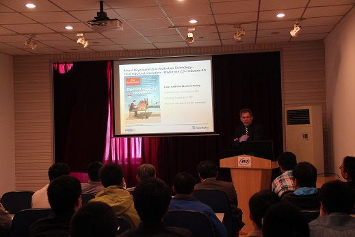 9月18日上午,Prof. Ingomar Kelbassa受聘我校客座教授儀式在行政樓121會議室舉行,副校長安實為Prof. Ingomar Kelbassa頒發(fā)聘書。客座教授授銜儀式后,陳彥賓教授向Prof. Ingomar Kelbassa介紹了重點實驗室的整體情況,并就雙方在有關領域的合作深入交換了意見。Prof. Ingomar Kelbassa在激光增材制造領域有13年的研究經(jīng)歷,在國際上享有較高的學術地位和影響力。接著Prof. Ingomar Kelbassa為重點實驗室?guī)熒鲱}目為”Laser Additive Manufacturing”的講座,他首先介紹了激光增材制造技術的潛力及發(fā)展趨勢,接著列舉了激光增材制造在航空航天、汽車制造等行業(yè)的應用,介紹了Fraunhofer ILT在激光增材制造技術方面的研究成果,最后提出了自己對該技術的獨特看法。廣大師生與Prof. Ingomar Kelbassa就激光增材制造技術的相關問題開展熱烈的討論。