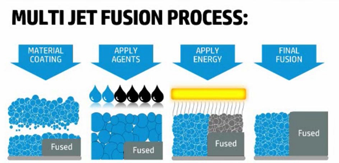 該技術的工作方式很有趣:先鋪一層粉末,然后噴射熔劑,與此同時還會噴射一種精細劑(detailing agent),以保證打印對象邊緣的精細度,然后再在上面施加一次熱源。這一層就算完成了。以此類推,直到3D對象完成。(見下圖)