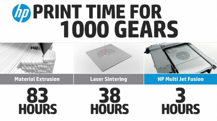 如上面所述,惠普的這款3D打印機的打印速度將超過當下最快的增材制造設備的10倍。為了更加形象和易于理解,惠普提供了一組統計數據。以批量生產1000個齒輪為例,使用高品質的激光燒結設備,這些齒輪至少需要38小時才能制造出來。而使用他們的新多噴頭熔融技術,只需3個小時即可完成。